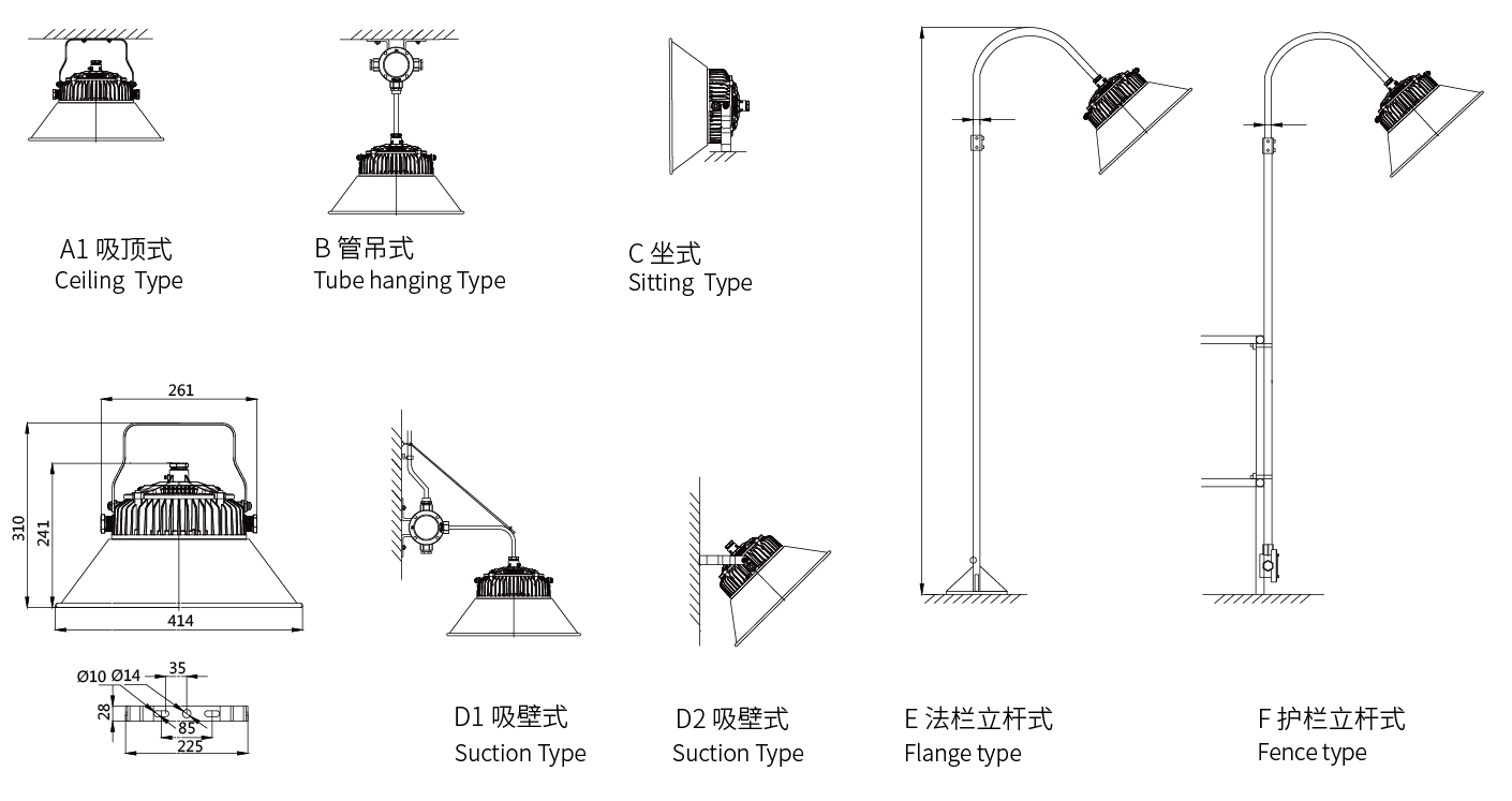 安裝方式:可根據(jù)需求采用吸頂、吸壁、彎桿等多種安裝方式,滿足低頂、平臺、高頂、高棚等多種場所作為固定照明使用,產(chǎn)品采用抗震材料和減震結(jié)構(gòu),尤其適合應(yīng)用在各種高頻率、強(qiáng)震動場所。